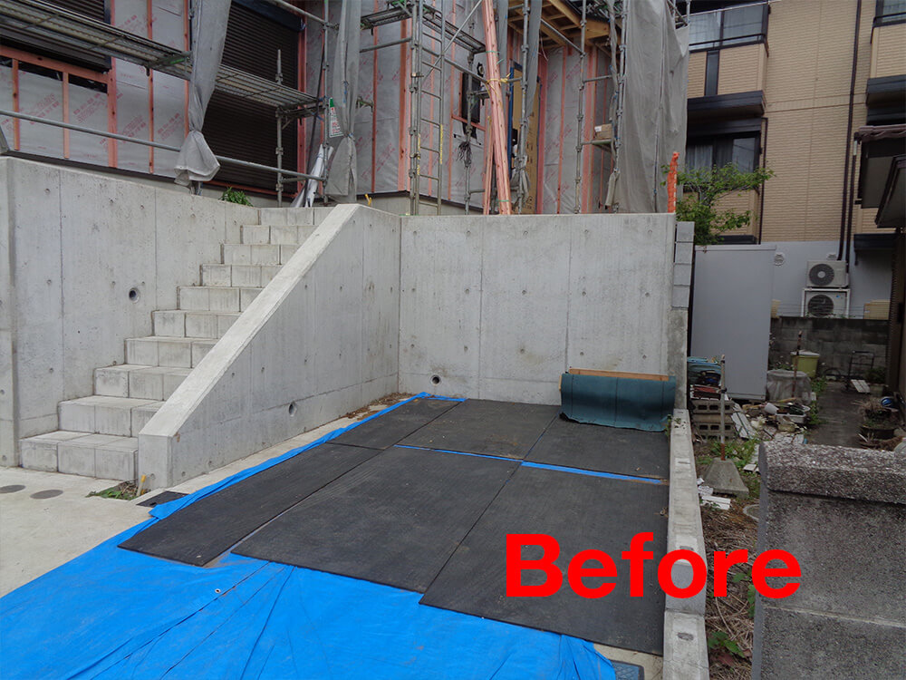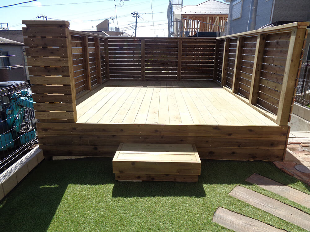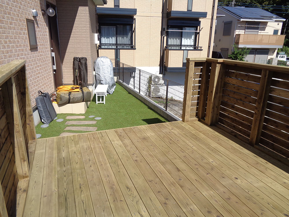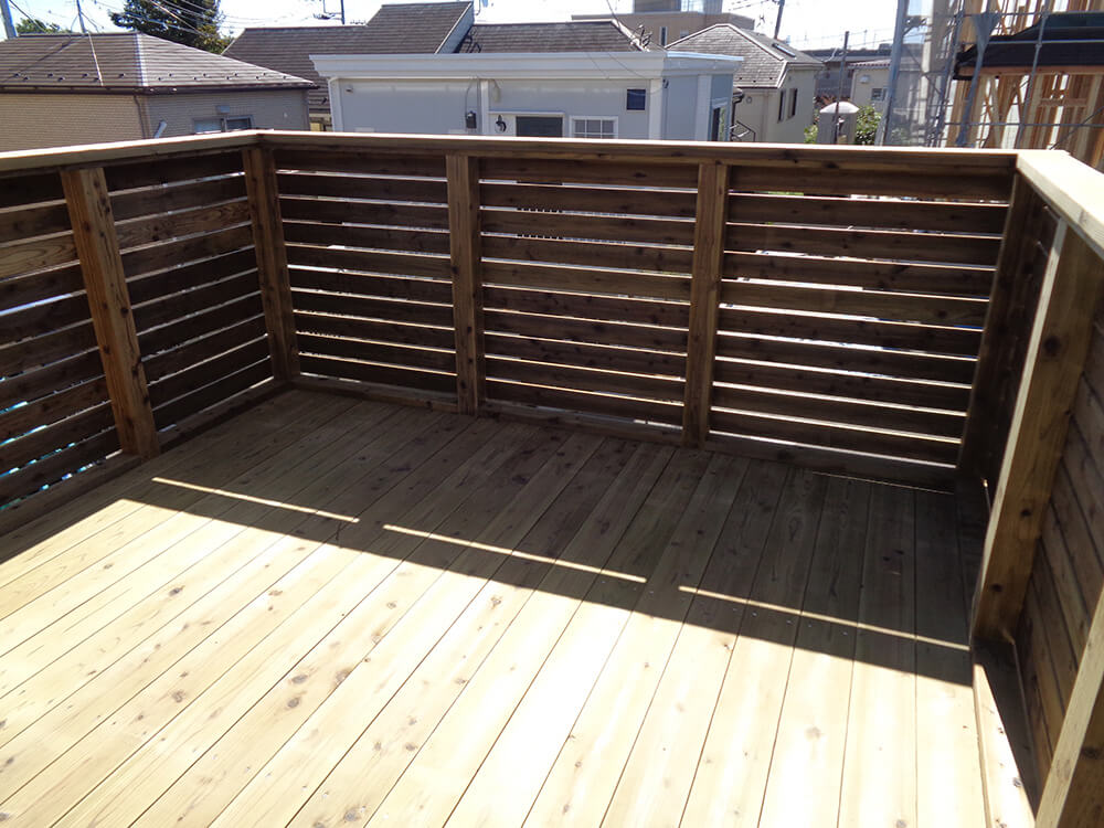 広さは約11平米。コの字に横板張りデザインフェンスで囲みました。