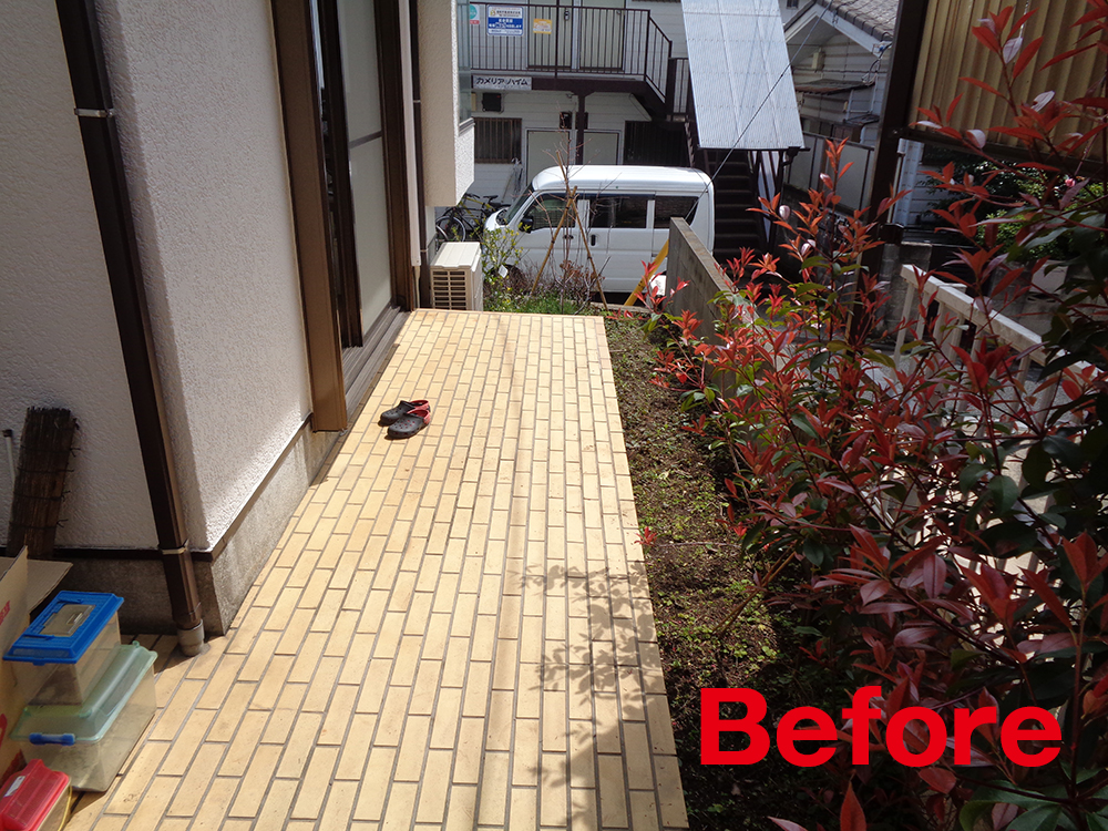 掃き出し窓からフラットでブロックまで奥行きをだし、目隠しフェンスを立てるプランをご提案させていただきました。目隠しフェンスの高さは1m50㎝にしました。