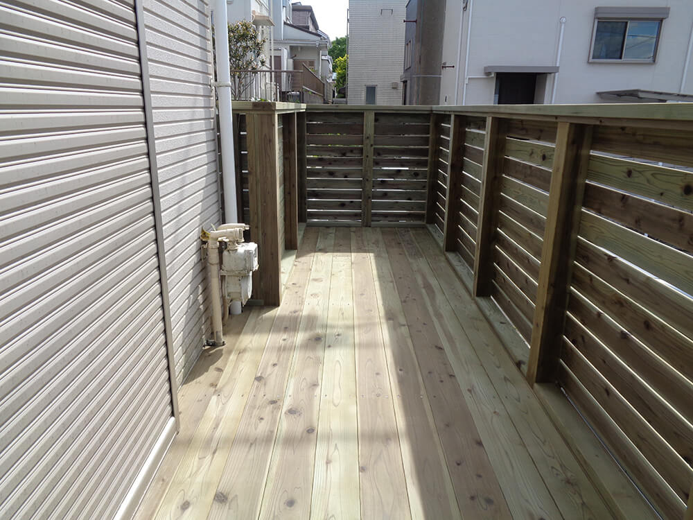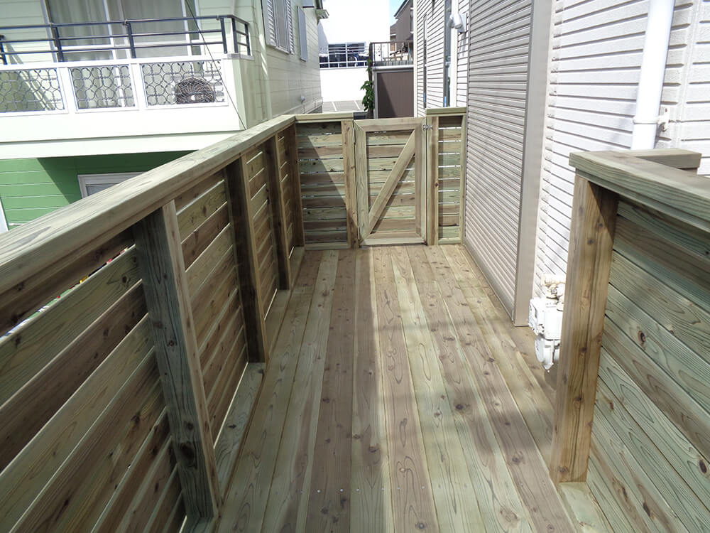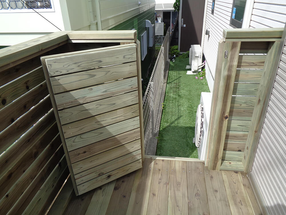 擁壁下まで敷地でしたので、少しでも奥行きを広く取るために擁壁から敷地いっぱいまで張り出しウッドデッキを完成させました。
