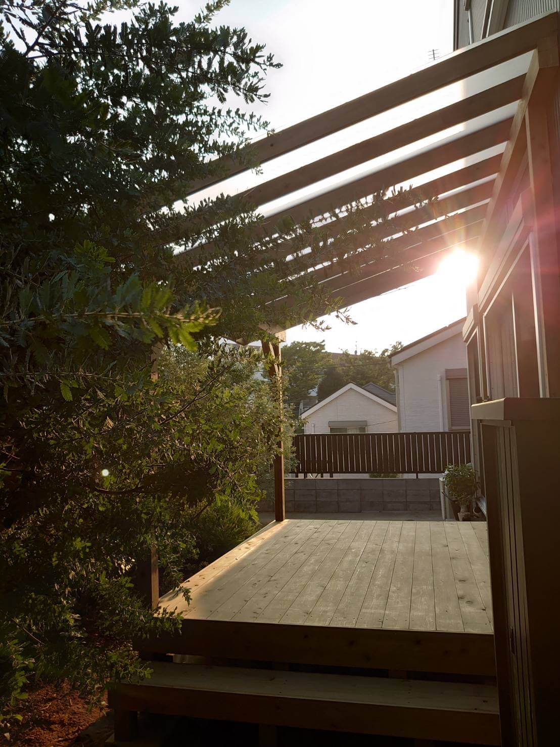 優しいヒノキのぬくもりが庭木とマッチし、立体感のあるパーゴラが住まいを表情豊かにしてくれます。ステップは段差や隙間ができないようブロックに合わせています。