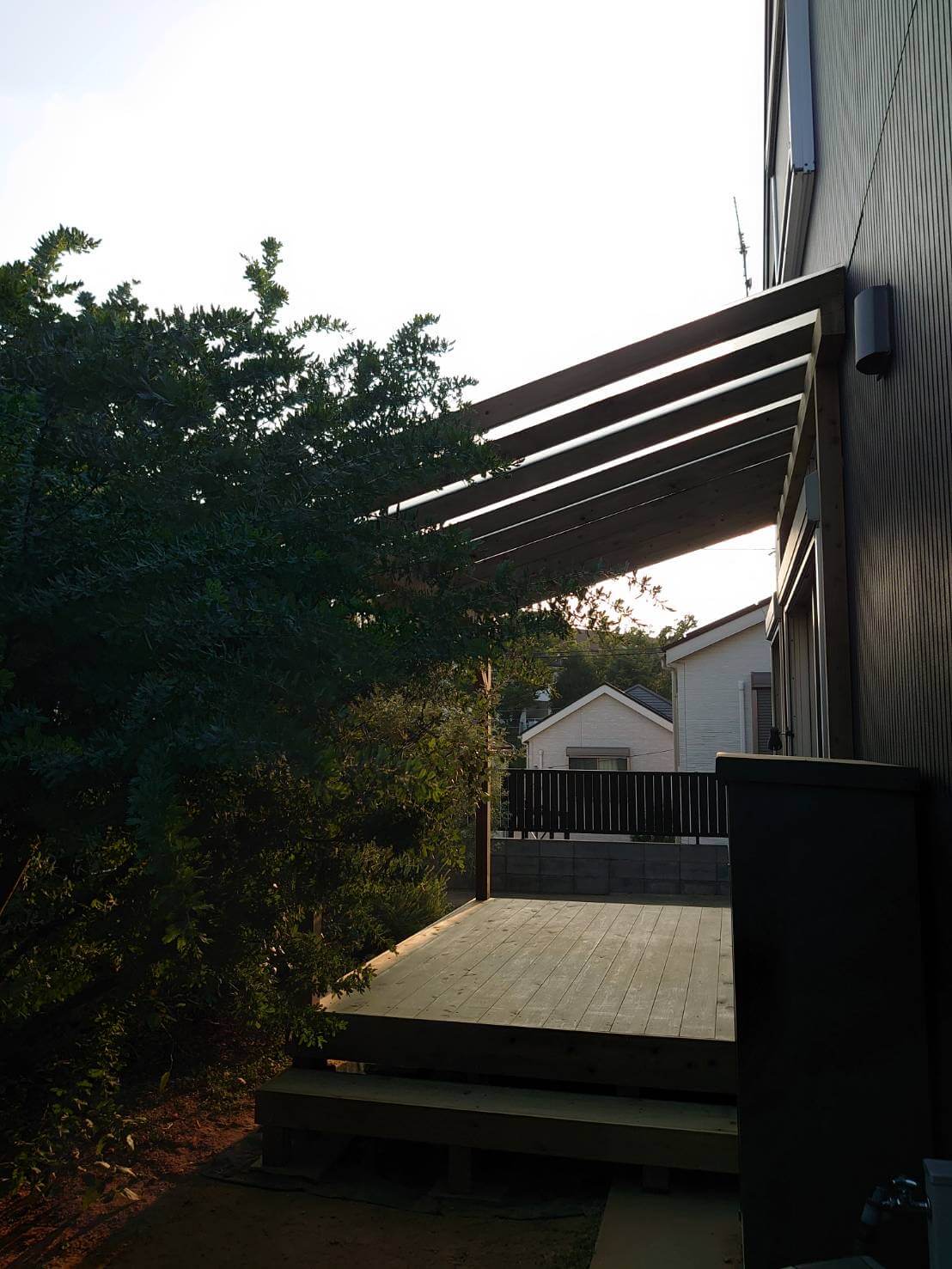 一軒家のお庭にウッドデッキをご検討中。パーゴラにポリカ屋根もご希望です。